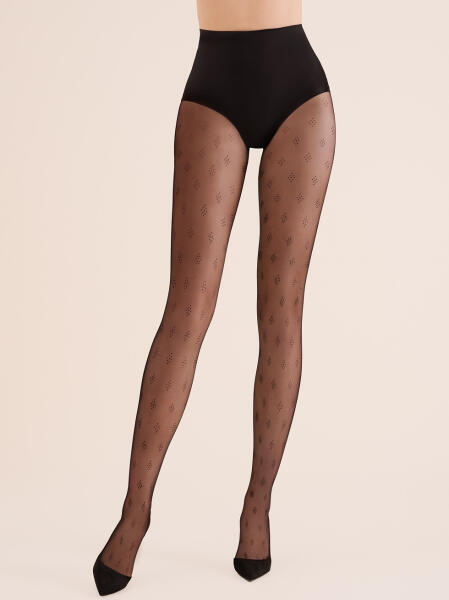 Női harisnya - vastagsága 20 den - finom geometrikus minta - láthatatlan megerősítés a csúcsokon - külön nadrágrész nélkül - lapos varrás, pamut szegély - Elasztikus szálak Összetétel: 84% poliamid, 15% elasztán, 1% pamut